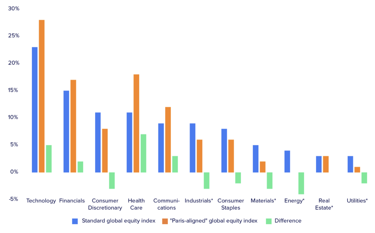 >>click to zoom in Though a welcome signal, investors point out that the EU focus on emissions reductions poses unintended consequences – risking decarbonisation on paper rather than in the real world.Our working group set out in June 2022 to assess the impact of current EU regulations and suggest ways to improve the next generation of net zero benchmarks. They also analysed the current market, inviting eight index providers to present their net zero offerings. Overlooked sectorsBenchmarks and market indices describe the performance of a security market, market segment, or asset class. Index providers create them by aggregating sets of securities and (or) assets based on pre-set criteria, and they often act as a performance measure for an investment strategy and portfolio manager.The market share of investment vehicles that track a benchmark has grown steadily over the past three decades. As of 31 March 2023, more than 30% of the estimated USD $15.5trn invested in global public market assets are invested in passive strategies tracking a pre-specified benchmark.This, together with the EU’s emphasis on emissions reductions is encouraging. However, to comply with those regulations, net zero benchmarks tend to overweight less-material sectors to climate change: such as communications, technology, and health care to achieve emissions reductions.