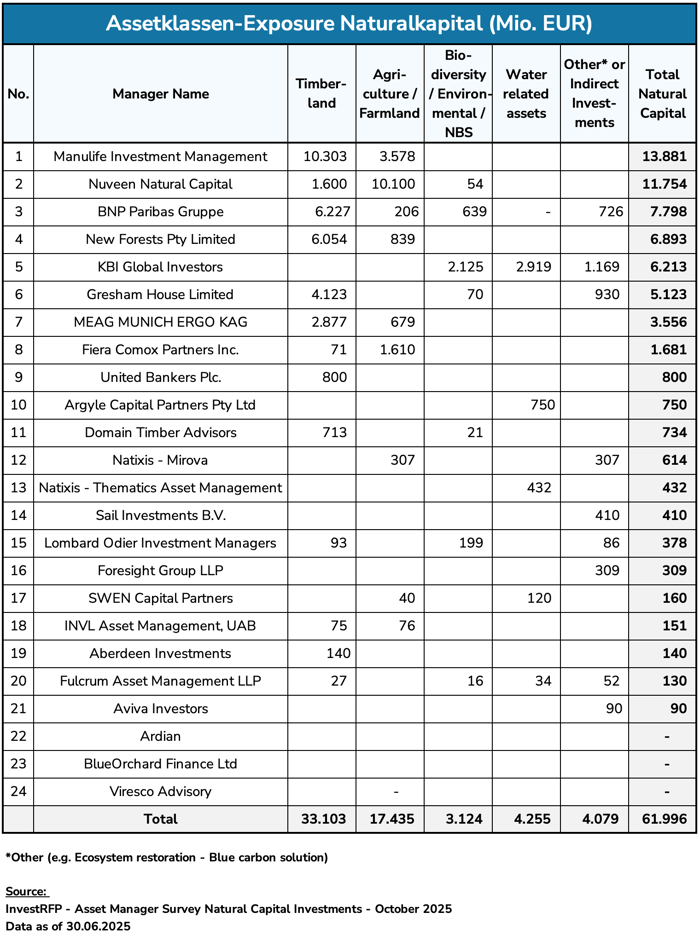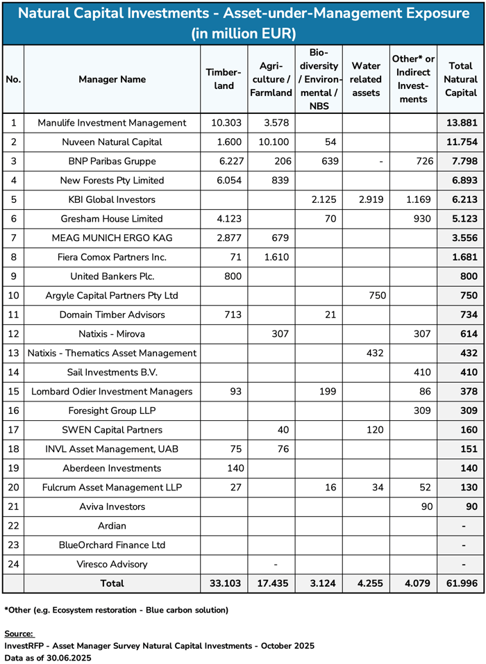 The asset managers surveyed in November 2025 by investRFP are listed according to their volume of natural capital assets under management. Managers without disclosed exposure figures are nonetheless established players offering innovative investment concepts within the asset class.