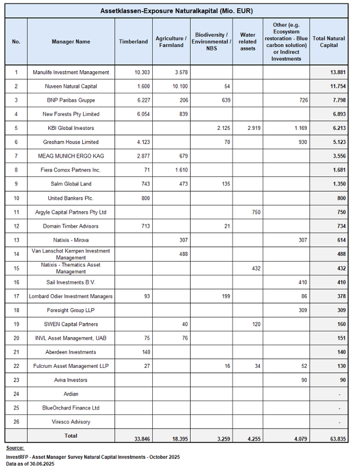 Nachfolgend sind die Asset Manager gemäß ihrem Managementexposure an Naturalkapital angegeben, die an der Umfrage „Natural Capital Investment Solutions“ teilgenommen haben.