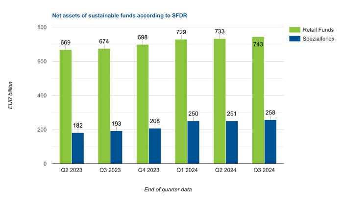 Retail funds in accordance with Article 8/9 of the EU Sustainable Finance Disclosure Regulation (SFDR) account for more than three quarters of the assets, with a total of EUR 743 billion.